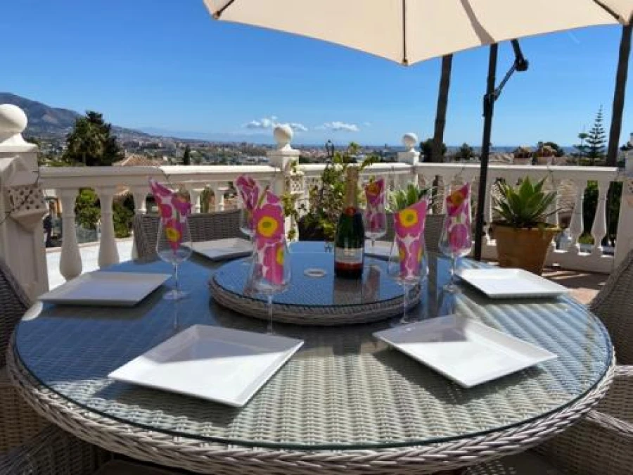 Located on the sunny coast near Fuengirola, this stylish 4-bedroom, 3-bathroom villa blends Nordic design with Andalusian charm. Enjoy breathtaking views over Mijas Valley, the Mediterranean Sea, and even the Sierra Nevada.